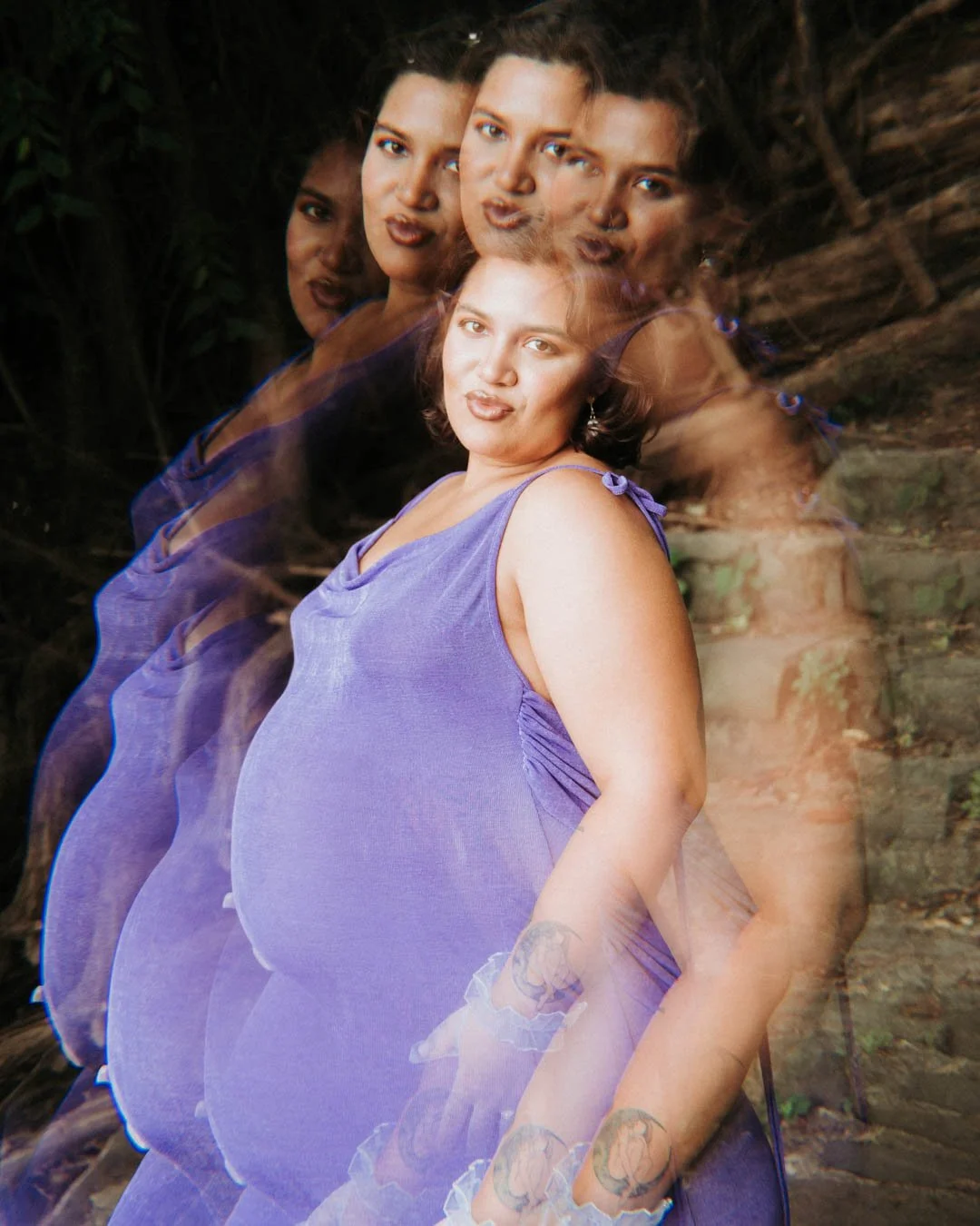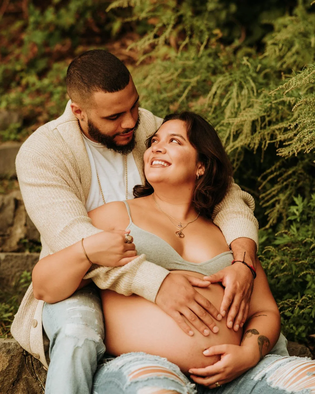 Fast forward to after the gender reveal, Taty hit me up so excited with ideas about her maternity session and where she wanted to have it done, what she wanted to wear and how she really wanted to feel when she looks back at the images. We coordinated her outfits and she decided on three separate outfits but actually got four because of what she was wearing when she arrived which was such a cute prego soon to be momma vibe I loved it (photo above)! Outfit #1 was a purple dress with the color purple having a big significance to her and I just so happen to have purple flowers and made a small bouquet out of them to add that lil hint of pizzazz! Outfit #2 was this beautiful lace dress and it made her look like a forest angel with that scenery of the greenery surrounding us and the color green being another color of big significance in her life it felt like we were in another world with how the shrubbery looked! Finally outfit #3 was nothing but a pasties and pearls, thats it! Youβll see ;)